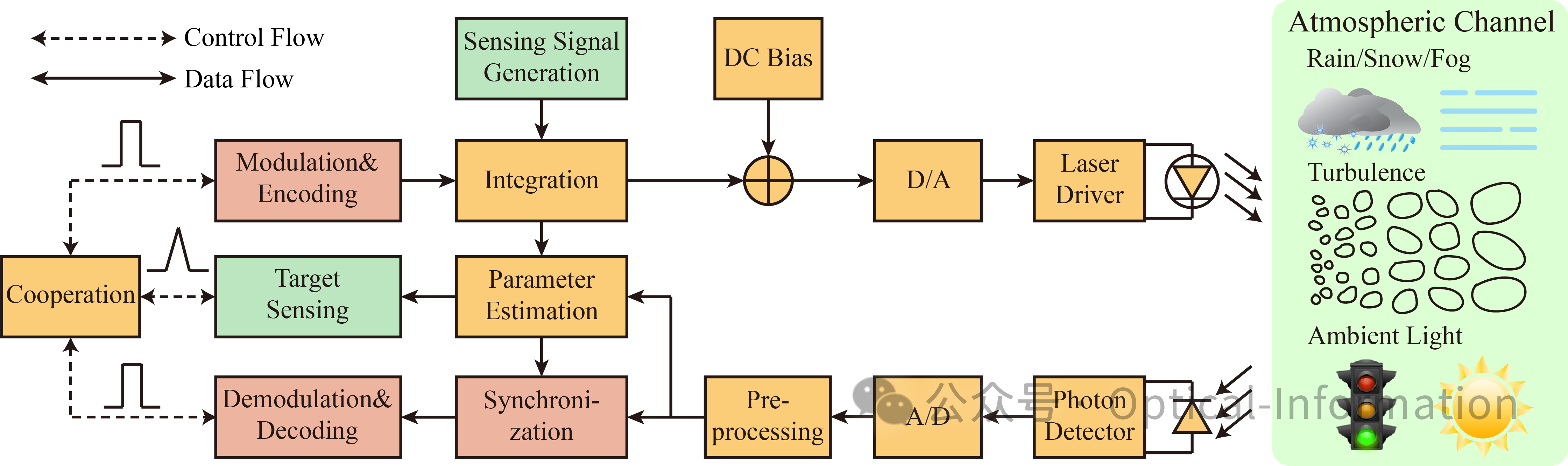 未来移动通信网络需要具有同时高速率通信和高精度感知的能力,而通信和感知系统的独立发展难以满足这种需求。由此,通信与感知系统的共存、互惠与联合设计成为了学界与业界的共识,通信感知一体化(ISAC)也因此被视为第六代移动通信系统(6G)的六大核心场景之一。在射频通感一体化(RF-ISAC)快速发展的同时,无线光通感一体化(OW-ISAC)凭借其超大且无需授权的带宽和短波长的特性成为了新的研究热点——一方面,OW-ISAC拥有千兆级别高速率通信和厘米级别高精度感知的潜力,可作为RF-ISAC的有效补充;另一方面,如何在直接检测约束、评价指标缺失的背景下实现同时通信与感知,是OW-ISAC研究中最大的挑战。